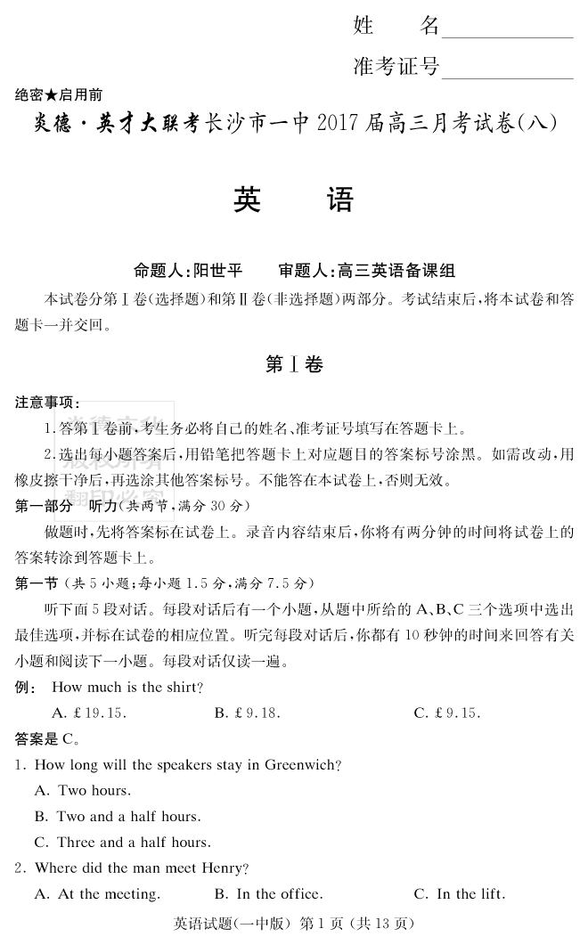 【英語】炎德英才大聯(lián)考2017長沙一中高三8次月考