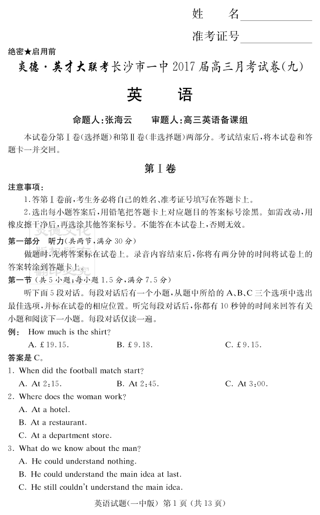 【英語】炎德英才大聯(lián)考2017長沙一中高三9次月考