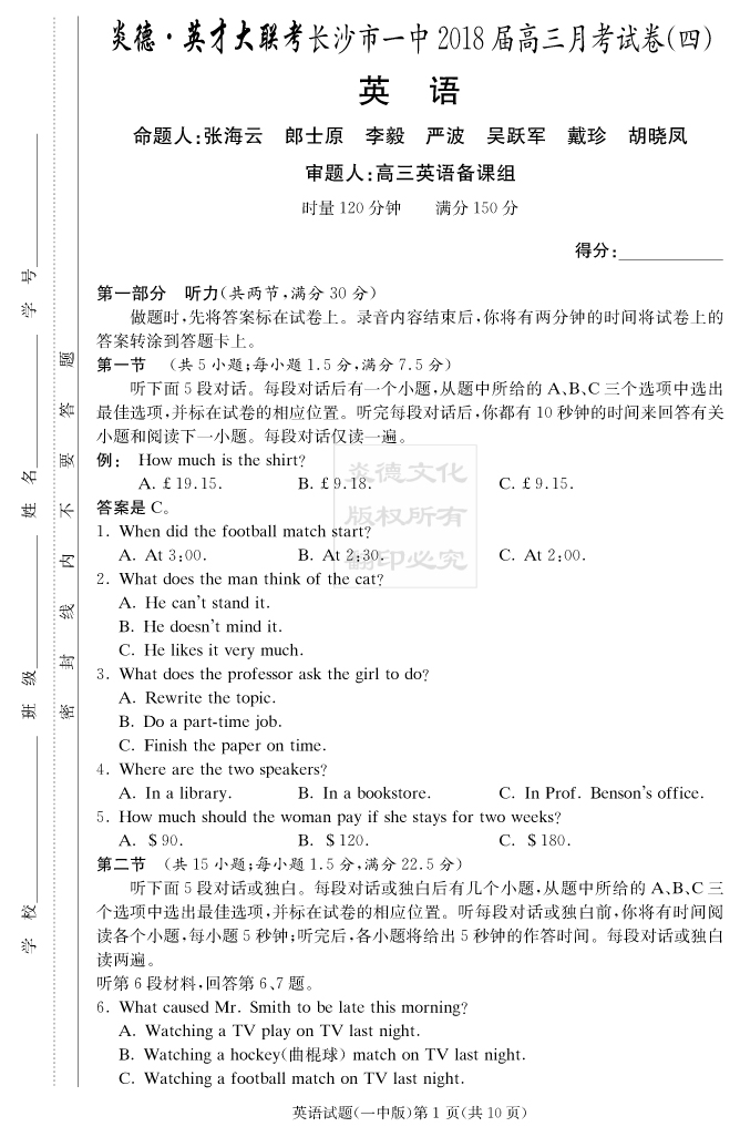 【英語(yǔ)】炎德英才大聯(lián)考2018長(zhǎng)沙一中高三4次月考
