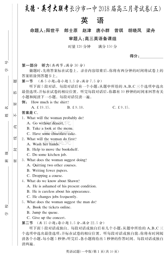 【英語】炎德英才大聯(lián)考2018長沙一中高三5次月考
